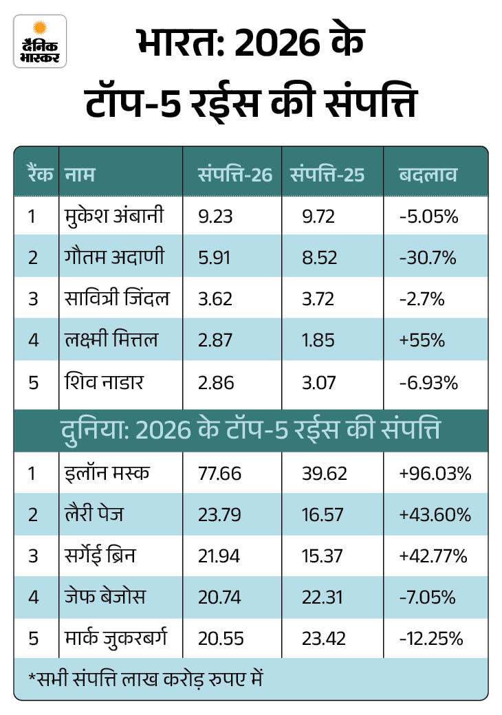 फोर्ब्स वर्ल्ड्स बिलियनेयर्स 2026 लिस्ट के मुताबिक भारत में अरबपतियों की संख्या बढ़कर 229 हो गई है। पिछले साल यह 205 थी। देश के चौथे सबसे अमीर व्यक्ति बने लक्ष्मी मित्तल की संपत्ति में इस साल सबसे तेज उछाल देखा गया।
