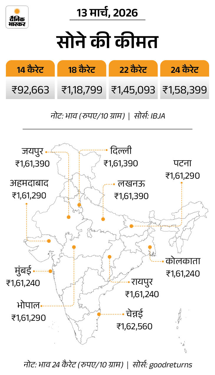 अमेरिका-इजराइल की ईरान से चल रही जंग की वजह से चांदी-सोने में आज 13 मार्च को गिरावट रही। इंडिया बुलियन एंड ज्वेलर्स एसोसिएशन (IBJA) के मुताबिक 10 ग्राम 24 कैरेट सोना 1,904 रुपए गिरकर 1.58 लाख रुपए पर आ गया है। इससे पहले 12 मार्च को सोना 1,60 लाख रुपए प्रति 10g था।
