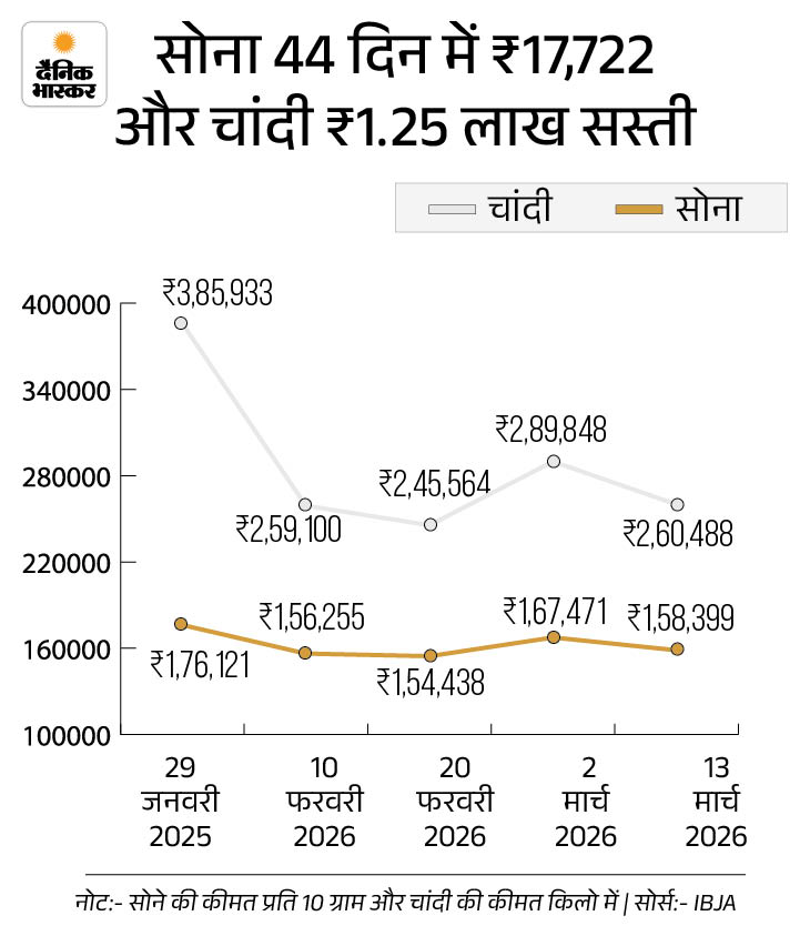 वहीं, चांदी के कीमत 31 दिसंबर 2025 को 2.30 लाख रुपए थी, जो 29 जनवरी को 3.86 लाख रुपए के ऑल टाइम हाई पर पहुंच गई थी। तब से अब तक 44 दिन में चांदी 1,25,445 लाख रुपए सस्ती हो गई है।
