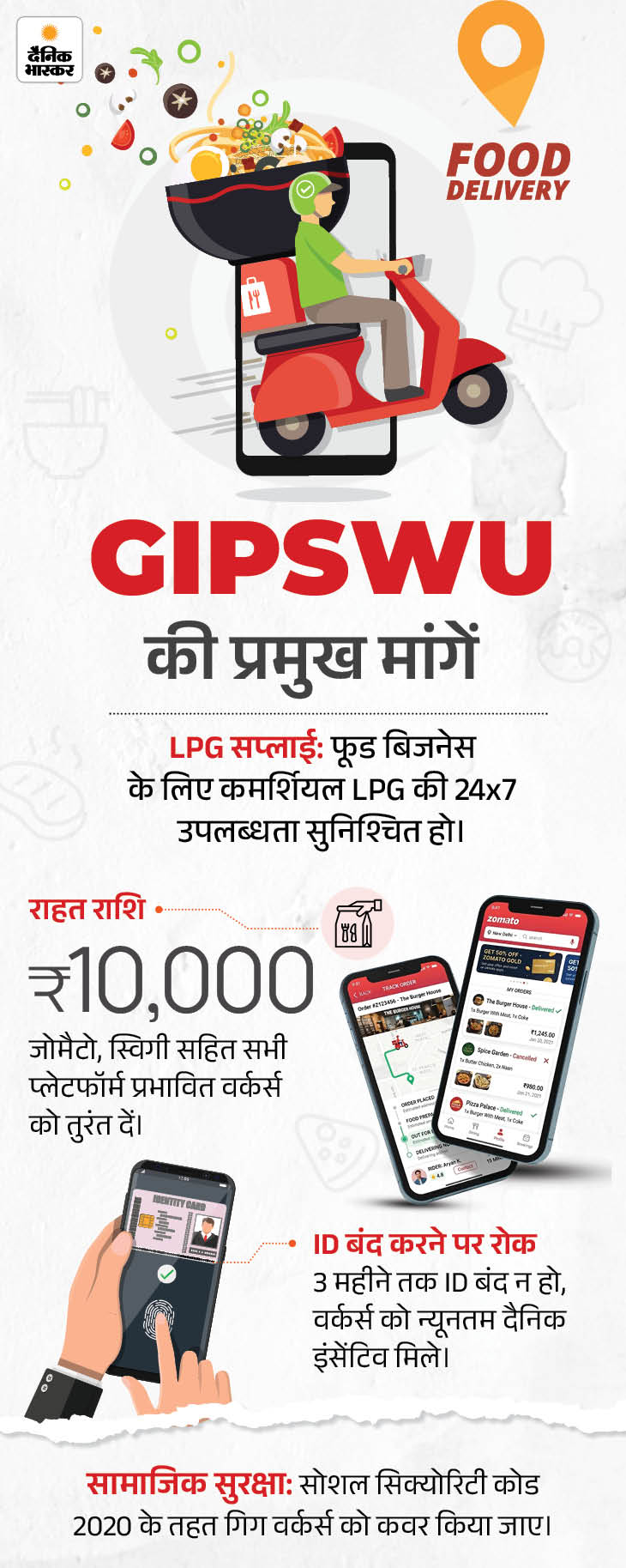 यूनियन ने केंद्रीय श्रम मंत्री को पत्र लिखकर तुरंत दखल देने की मांग की है। यूनियन की मांग है कि जोमैटो, स्विगी और दूसरे प्लेटफॉर्म्स प्रभावित होने वाले हर वर्कर को तुरंत 10,000 रुपए की राहत राशि दें। वर्कर्स की ID बंद करने पर 3 महीने की रोक लगे और उन्हें रोजाना कम से कम इंसेंटिव दिया जाए।